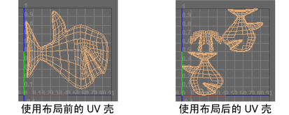 “排布”(Layout)功能可以自动重新定位 UV 壳,使这些壳不在 UV 纹理空间中重叠,并使壳之间的间距和适配达到最大化。这样有助于确保 UV 壳拥有自己单独的 UV 纹理空间。例如,如果将毛发应用到曲面,给定壳上的 UV 纹理坐标不得重叠。