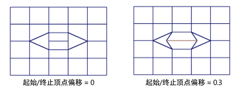 确定两个顶点在选定边(或循环边中一系列连接的边)两端上的距离将从选定边的原始位置向内偏移还是向外偏移。默认偏移为 0。“开始/结束顶点偏移”(Start/end vertex offset)单位基于选定边长度的百分比。