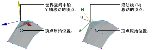 - 拖动“UVN”(“移动法线工具”(Move Normal Tool))操纵器以移动选定顶点。