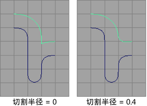 如果启用“循环剪切”(Loop Cutting),则使用“切割半径”(Cutting Radius)值。如果“切割半径”(Cutting Radius)值大于 0,则可以获取指定半径的圆弧,而不是获取已剪切循环位置的尖锐棱角。