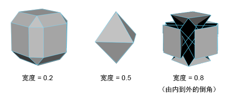 如果“偏移类型”(Offset Type)为“分数”(Fractional),则“宽度”(Width)值限制为介于 0 到 1 之间。“宽度”(Width)值为 1 时,该距离将成为可能的最大值(基于最短边),这样将不会产生由内到外的倒角。“宽度”(Width)值大于 1 将产生由内到外的倒角。