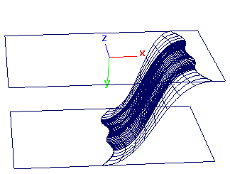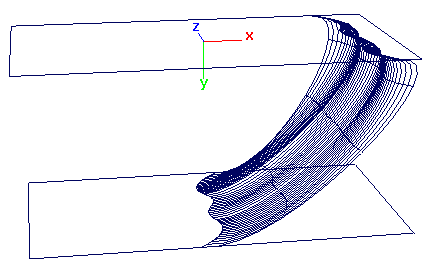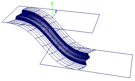 在混合曲面与顶部平面相交处,请注意曲率是如何朝平面的最左侧部分卷曲的。若将顶部平面绕其 Z 轴旋转 180 度,曲率仍会朝平面的同一部分卷曲。