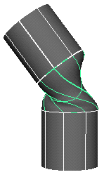 例如,假设已从一对圆柱体创建一个混合曲面,如下图所示。混合曲面为夹在在顶部圆柱体与底部圆柱体之间的弯曲圆柱体: