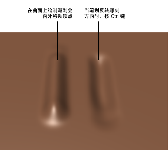 - 若要反转任何雕刻工具的雕刻方向,请按住 Ctrl 键并拖动光标穿过模型的曲面。