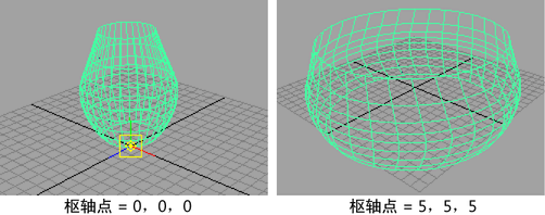 下图显示了如何在使用默认枢轴值以及 X、Y、Z 值为 5 时创建旋转曲面。
