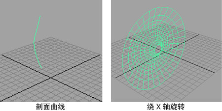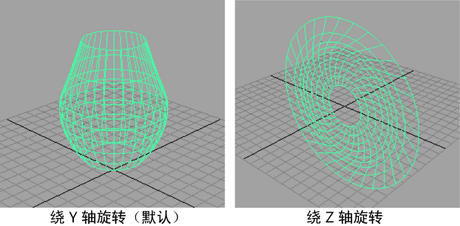 指定旋转轴。默认设置为 Y。下图使用透视视图中的每个旋转轴来旋转剖面曲线(在前视图中绘制)。