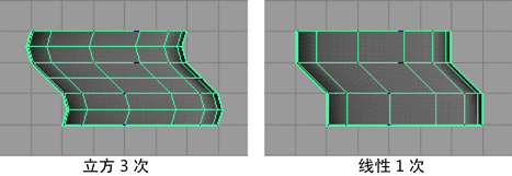 可以设定“曲面次数”(Surface Degree)为“线性”(Linear)或“立方”(Cubic)。这将设定 U 方向的放样曲面为线性或立方。“线性”(Linear)将创建看起来为面的曲面。“立方”(Cubic)创建平滑曲面。