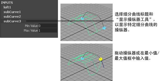 如果在创建好放样后在选项窗口中设定“曲线范围”(Curve Range)为“部分”(Partial),可以使用“属性编辑器”(Attribute Editor)用于由此生成的 subCurve。