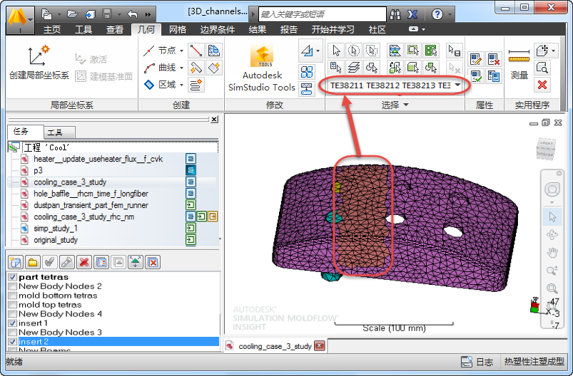 会为四面体单元指定识别标签“TE”。当您选择四面体单元时,选择列表中会列出标识符(由字母 TE 和其后面的数字组成)。