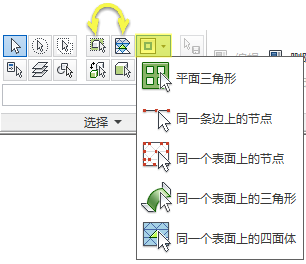 使用“展开选择为同一个表面上的节点”工具,可以针对三角形或 3D 网格选择形体表面上的所有节点。