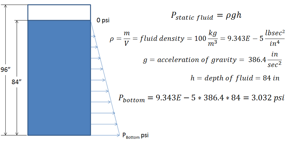 By performing a simple hydrostatic analysis of the tank, we determine that the pressure at the bottom of the tank with an 84 inch column of water is 3.032 psi: