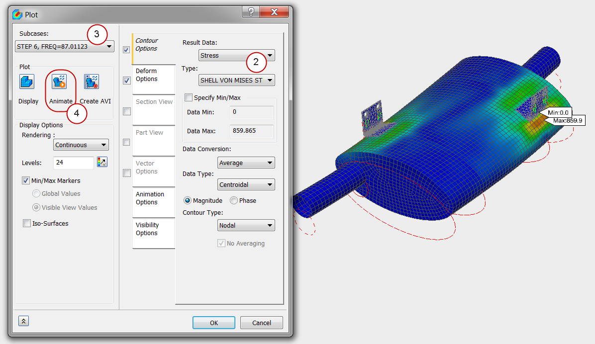 In this exercise, we shook the muffler with the road load inputs to see how much stress is expected since we still had natural frequencies in the operating range of the curve. From the resultant stress levels, we can determine if a fatigue study is required.