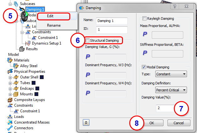 5. From the Subcases branch, right-click on Damping1, and click Edit.