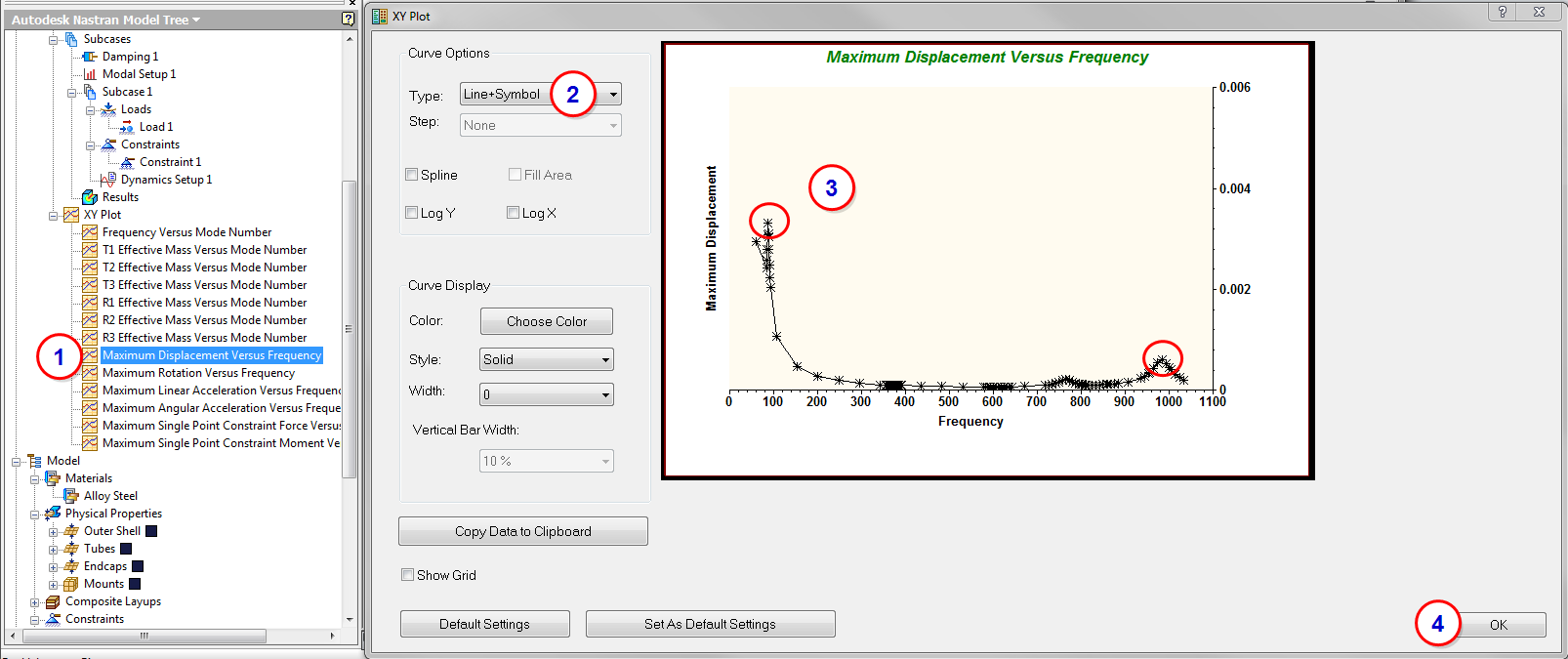 1. When finished, double-click the Maximum Displacement Versus Frequency plot from the Analysis tree.