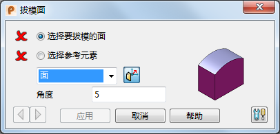 注: 如果输入的角度会导致拔模面与其它几何形体冲突,光标移到模型上时将变为