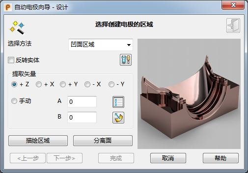 电极提取的初始方向在模型上通过箭头来指示,该箭头指向 +Z 轴的方向。