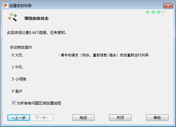 完成 - 如果选择相关选项,则为已选问题区域创建线框并关闭“创建密封向导”。
