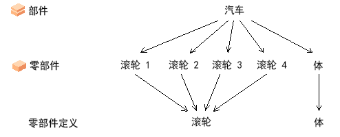 - 部件 - 在模型中的特定位置和方向上,从部件定义的实例创建可见对象。装配中的部件集合称为组,但组不定义装配层次。