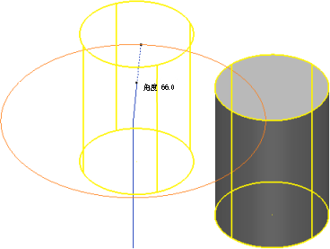 该直线一半是实线,一半是虚线。如果在拖动对象时光标位于实线部分上 ,则旋转角度将以增量为 15 的幅度变化。在将光标置于虚线部分上时 ,角度将以增量为 1 的幅度变化。如果移动光标,使其位于圆外部 ,则角度将以增量为 0.1 的幅度变化。