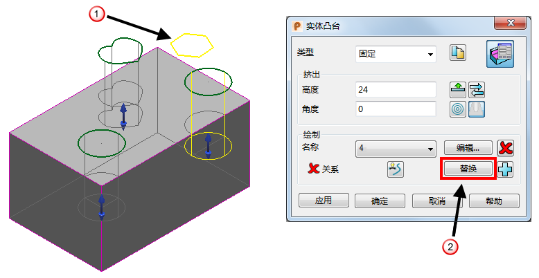 - 单击“应用”可使用替换线框重新创建凸台。被替换挤出实体的线框将保留在模型中。
