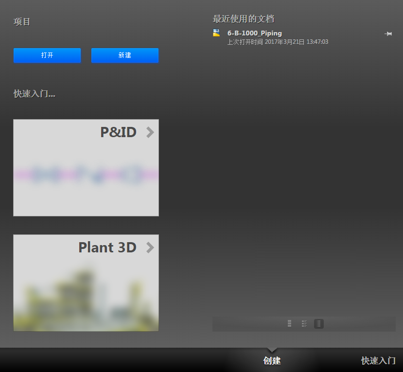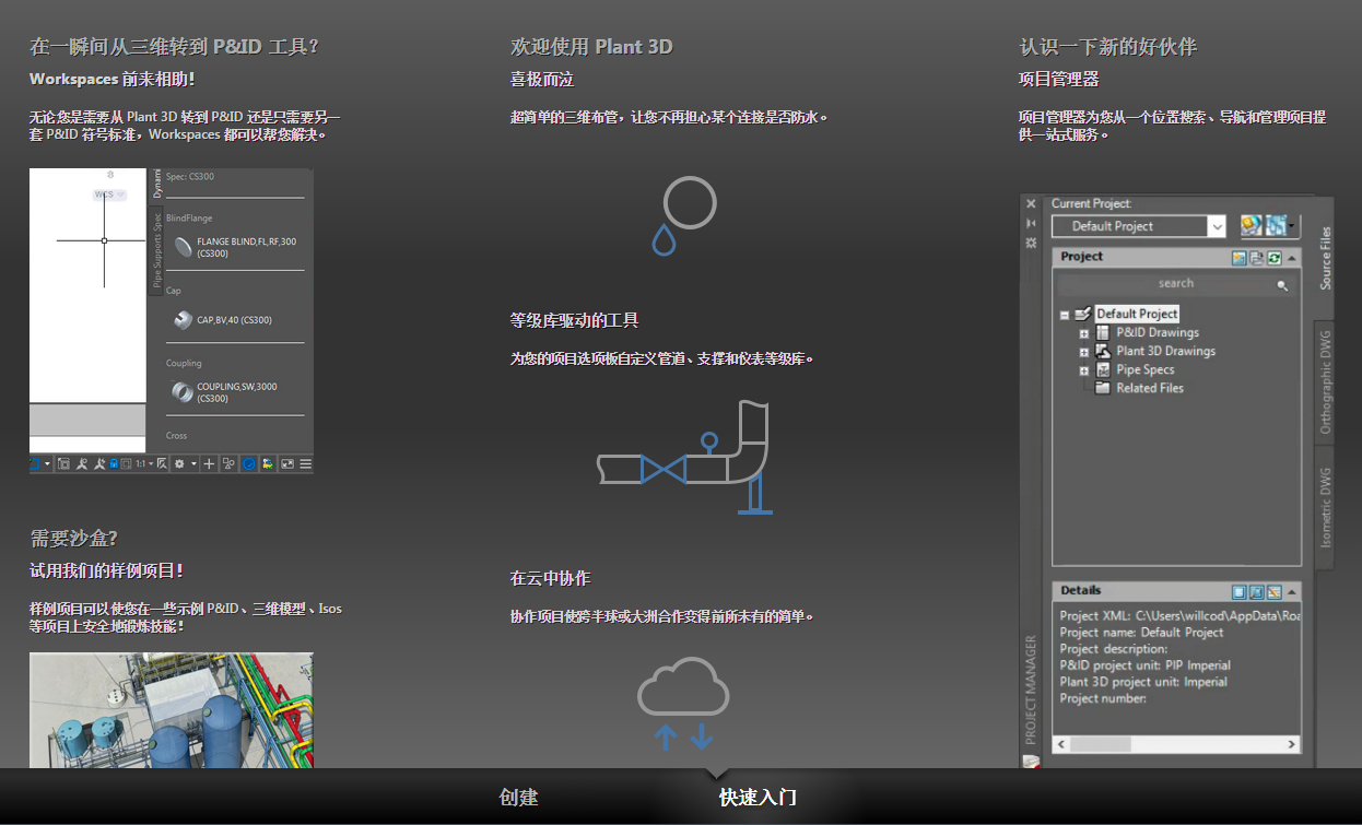“创建”和“快速入门”选项卡 - 这些部分已经更新,包括对具有每个项相关特定信息的 Plant 3D 和 P&ID 工作空间的选择。