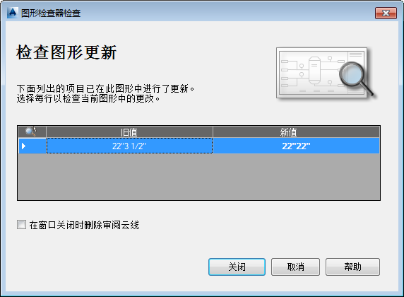 该表显示由图形检查器在文字或注释值中找到的差异。选择某行将缩放至当前图形中的已更新文字,这些文字显示在审阅云线内。