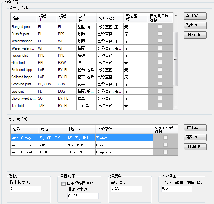 设置简单式连接和组合式连接类型。还设置最小管段长度、连接符显示设置和螺栓舍入因子。