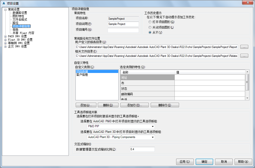 “项目设置”对话框的左侧显示树结构,由称为树节点的项填充而成。选择一个树节点时,会在右侧显示节点特定内容,可在此对项目设置进行更改或添加。