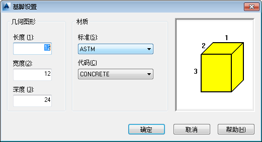设置基脚的默认几何图形设置。括号内指明的数值与预览图像中位号的几何图形相对应。