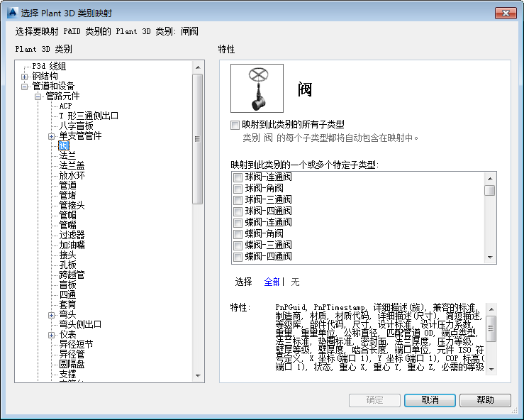 - 在“Plant 3D 类别”下,展开树。单击某个类别(例如:“阀”)。