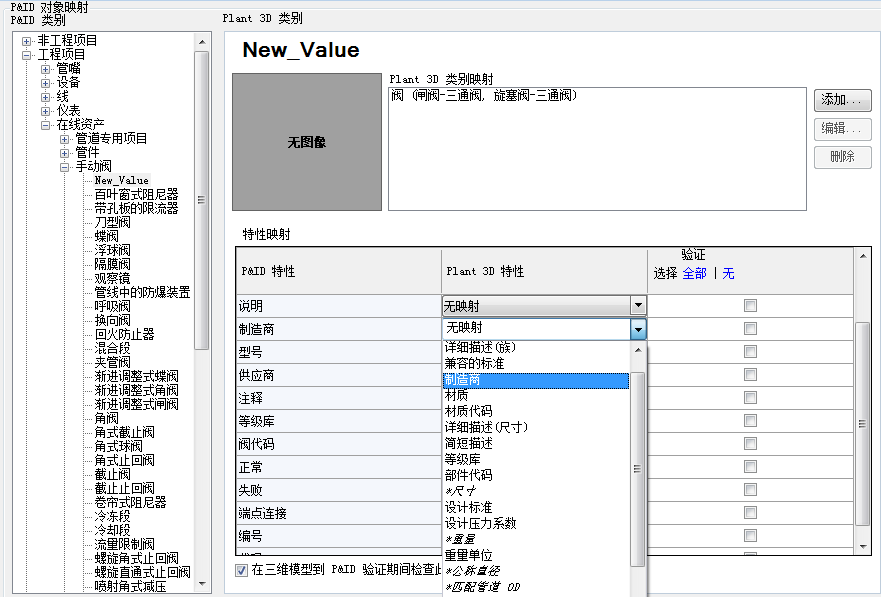 - 在“P&ID 对象映射”窗格的“P&ID 类别”下,展开树,然后单击新 P&ID 对象(例如:“New_Valve”)。