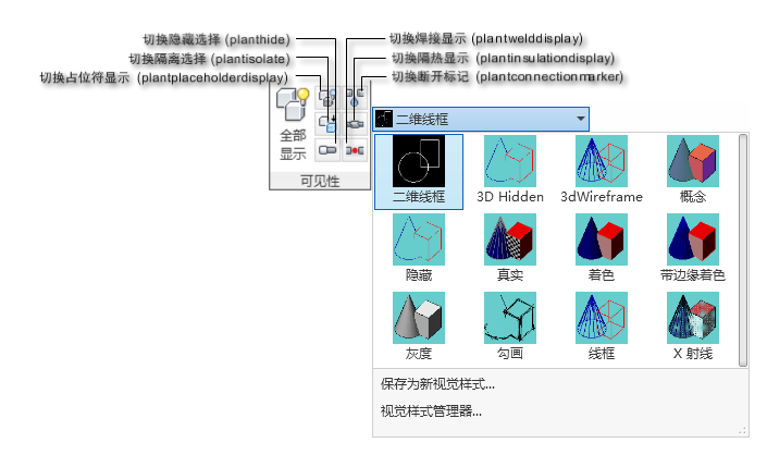 图标,可以轻松地隐藏或显示断开标记。 您可以更改显示样式,以更多或更少的真实感显示模型,具体取决于您的性能要求。也可以显示或隐藏单个 Plant 3D 对象。