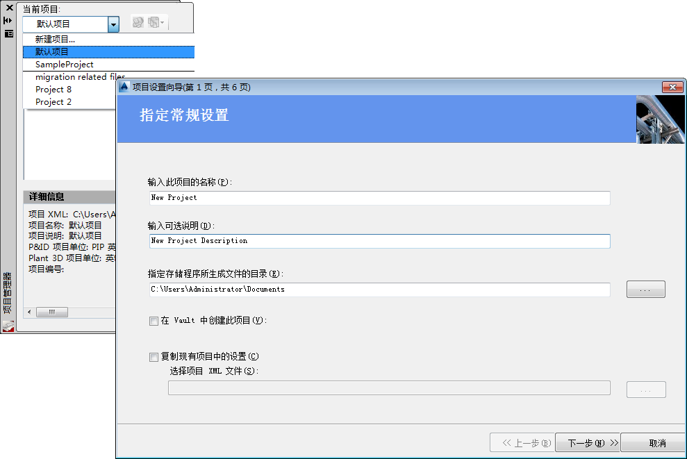 一般而言,项目样板由 CAD 管理员设置。样板指配置设置符合公司标准的现有项目。CAD 管理员可以将其他项目指定为样板,然后设置新项目的名称和位置。新项目会继承用作样板的项目的设置,但是可以更改这些设置以满足当前要求。