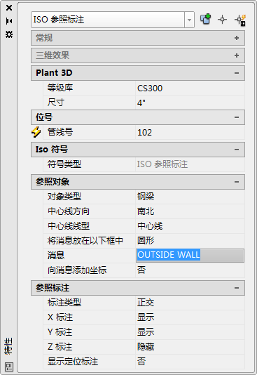 plantisoaddrefdim 将 ISO 参照标注放置到管道中并为新的 ISO 参照标注显示“特性”选项板。