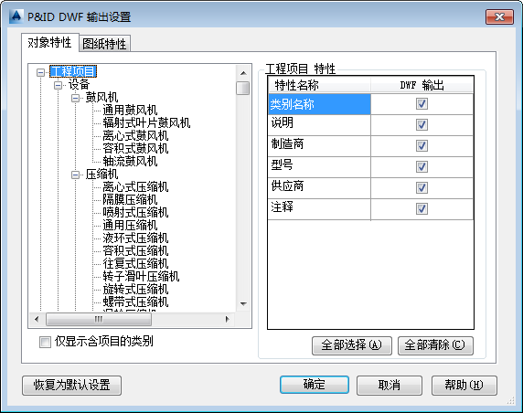 - 在“输出设置”对话框中的“对象特性”选项卡上,选中“仅显示含项目的类别”复选框。