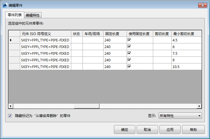 您可以使用等级库编辑器,在项目的管道等级库中设置“使用固定长度”和“固定长度”特性。若要启用新的固定长度管道布管功能,则必须设置固定长度特性。