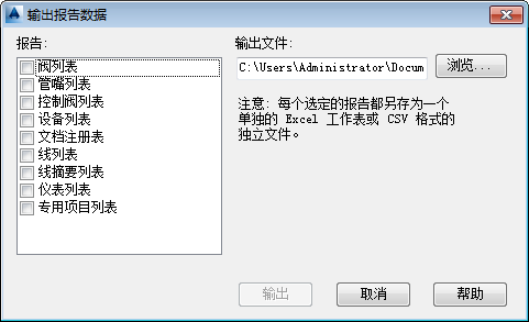 将选定报告输出为指定的文件名,输出到指定的文件夹。选择的每种报告类型显示在 Excel 电子表格中的单独工作表或存为单独的 CSV 文件。