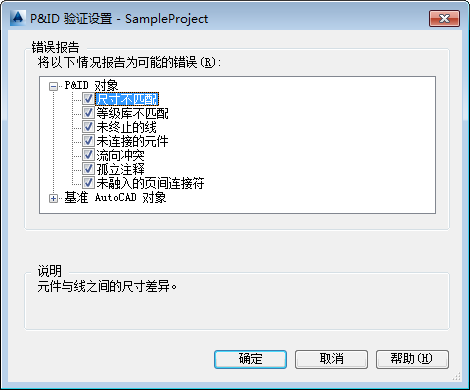 在“P&ID 验证设置”对话框的“错误报告”树中,展开 P&ID 对象和基准 AutoCAD 对象节点。选择要在项目验证过程中标记的错误类型对应的复选框。