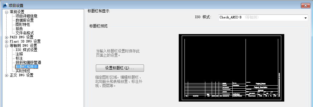 - 在“项目设置”树状图中,展开“等轴测 DWG 设置”。单击“标题栏和显示”。