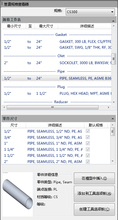 显示 AutoCAD Plant 3D 中的当前等级库,并使您可以打开和查看等级库工作表、将等级库工作表中的零件插入到模型中,以及修改工具选项板。