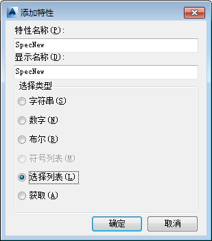- 在“显示名称”下,输入希望在数据管理器或“特性”选项板中显示的新特性名称(例如:“SpecNew”)。