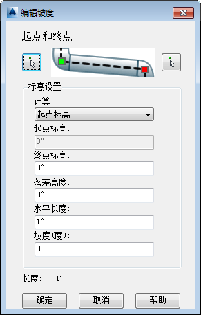 在“计算”列表中,单击“坡度”。通过坡度计算,可以设置起点标高和终点标高。也可以使用“起点标高”或“终点标高”输入坡度角或坡度落差高度。