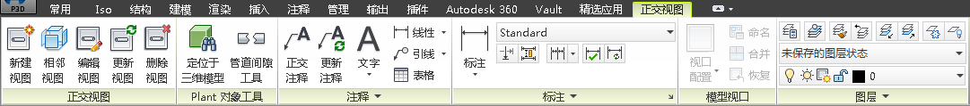 “正交视图”上下文选项卡是“三维管道”工作空间的一部分。