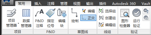 P&ID“常用”选项卡是“P&ID PIP”、“P&ID ISO”、“P&ID ISA”、“P&ID DIN”和“P&ID JIS/ISO”工作空间的一部分。
