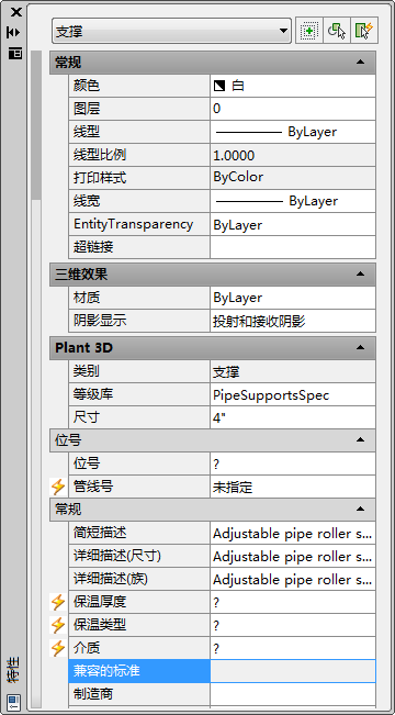 在“特性”选项板中,可以更改对象数据(如管道规格、保温类型或厚度等)。在“特性”选项板中,也可以访问“指定位号”对话框,在此对话框中可以更改位号信息。