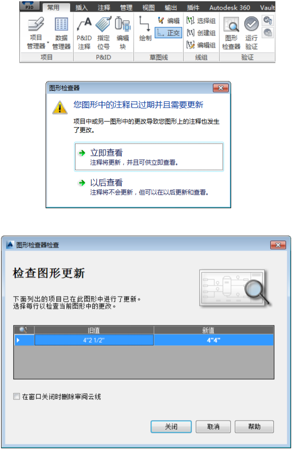 图形检查器会对照当前项目特性检查 P&ID 中所有文字和注释,以查找由在图形外部所做的最新更改而导致的差异。它可以为当前图形标识更新。