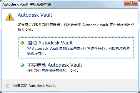 不要使用 Autodesk Vault Client 来打开 Plant 项目。首次打开 Plant 项目时,请关闭当前的项目,然后使用项目管理器从 Vault (