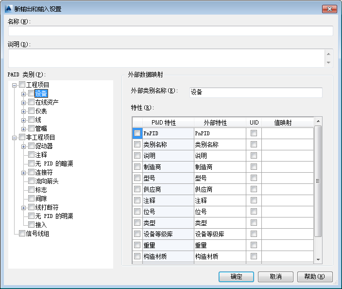 显示与 P&ID 特性等效的外部数据特性列表。默认情况下,外部特性名称与对应的 P&ID 特性名称相同。可根据需要更改外部特性。 “外部特性”字段不能为空。在退出对话框之前输入特性。 |