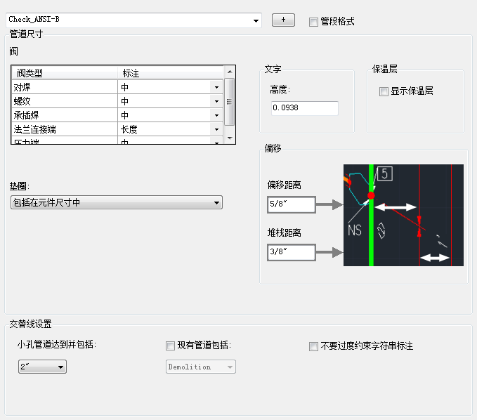 列出可以为其指定标注样式的阀类型。对于每种阀类型,可以指定总体长度和中心。