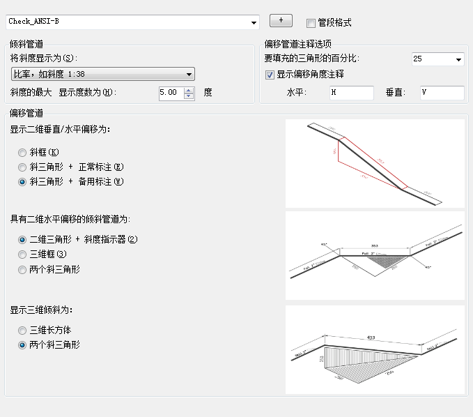 指定斜度类型。选项包括角度、比率、百分比、渐变色、英制倾角、公制倾角、隐藏斜度线指示。
